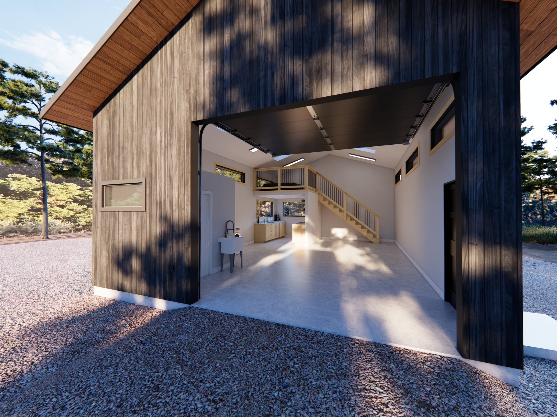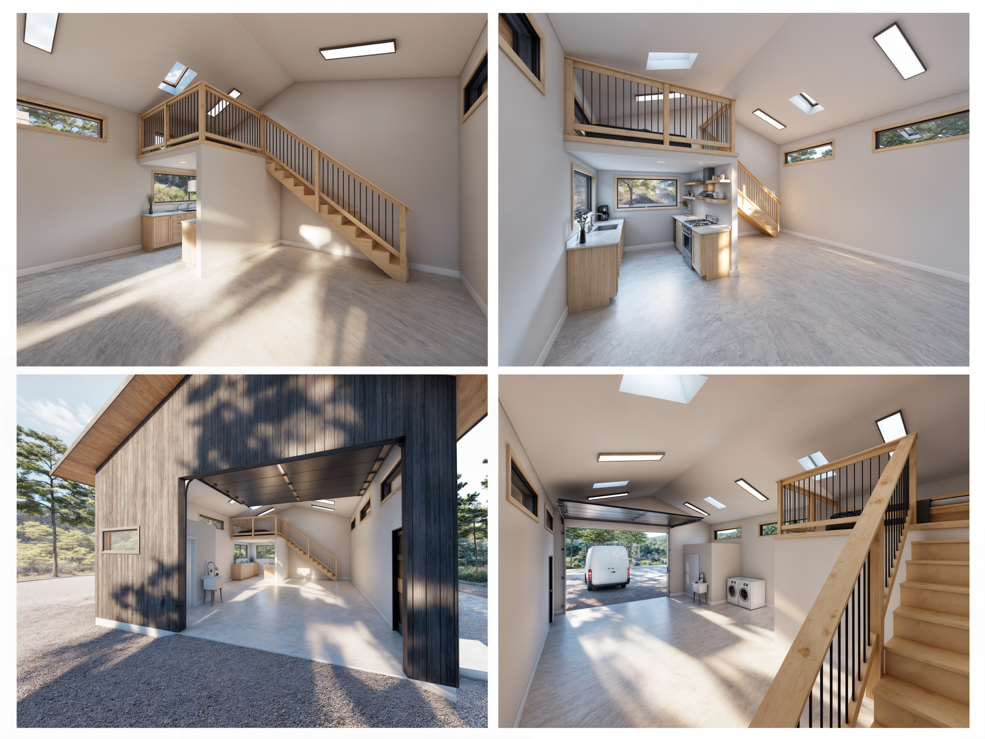 Printable PDF plans for a 704-square-foot live-work garage and shop space, featuring a kitchen, sleeping loft, and 1 bath. Hookups for laundry, shop sink, and space for additional sleeping loft. Enough room for the absolute largest Sprinter van, or two small cars. Designed to meet international and California residential building codes.