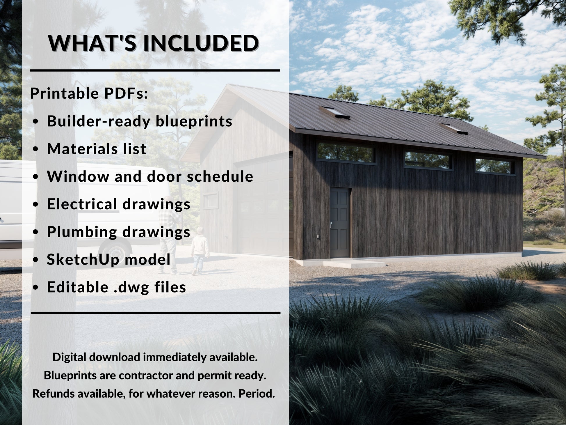 WHAT’S INCLUDED: Instantly available digital download includes printable PDF builder-ready blueprints, a materials list, door and window schedule, electrical drawings, and plumbing drawings, and a guide on general building options and how you might approach this project. 3D SketchUp model and editable .dwg files also included.