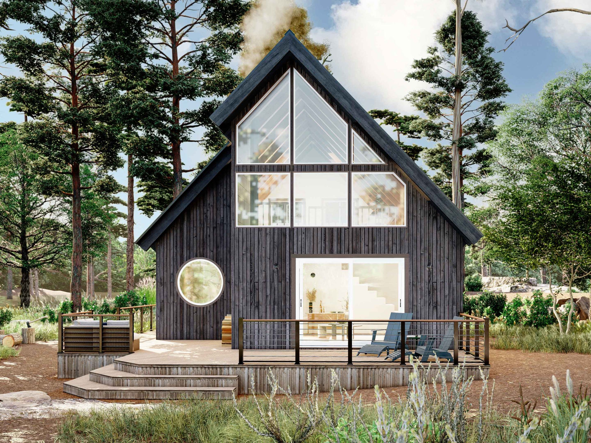 Printable PDF plans for a 1,250-square-foot cabin, featuring a full kitchen, two bedrooms, and 1.5 baths, with high ceilings, open timbers, and large picture windows. Designed to meet international and California residential building codes.